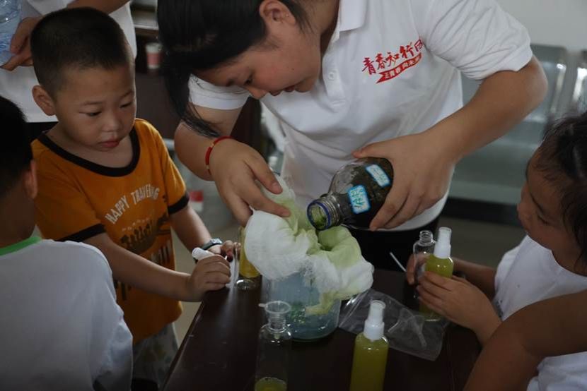 图1 实践队队员和小朋友一起制作“火山喷发”模型