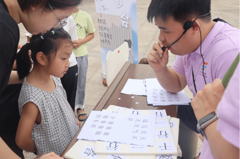 “扁担宽,板凳长......”伴随着《中国话》的轻快旋律,游园活动正式启动。实践队员与孩子们齐声合唱,在朗朗歌声中感受国家通用语言的韵律之美。活动现场,孩子们依次闯关:在“多音字”关卡标注拼音区分语义,于“趣味断句”环节辨析语句停顿,通过“猜灯谜”领略汉字谐音妙趣,在“绕口令”挑战中锤炼发音准确度。