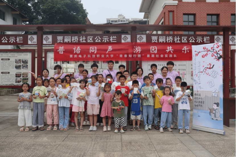 为高质量推广国家通用语言文字,助力乡村文化振兴与铸牢中华民族共同体意识,2025年7 月 9 日,重庆电子科技职业大学 “青春知行团” 推普实践队走进重庆市江津区贾嗣镇,开展 “普语同声,游园共乐” 主题推广活动,以趣味互动为乡村儿童搭建普通话学习平台。