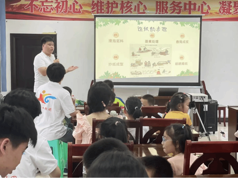 “沤料、冲洗、蒸煮、捣料、抄纸、分纸、晒纸……”队员们借助视频、图片等资料,详细介绍造纸术的发展历程与传统工艺,讲述蔡伦改进造纸术的历史故事,让孩子们感受古代发明家的智慧。