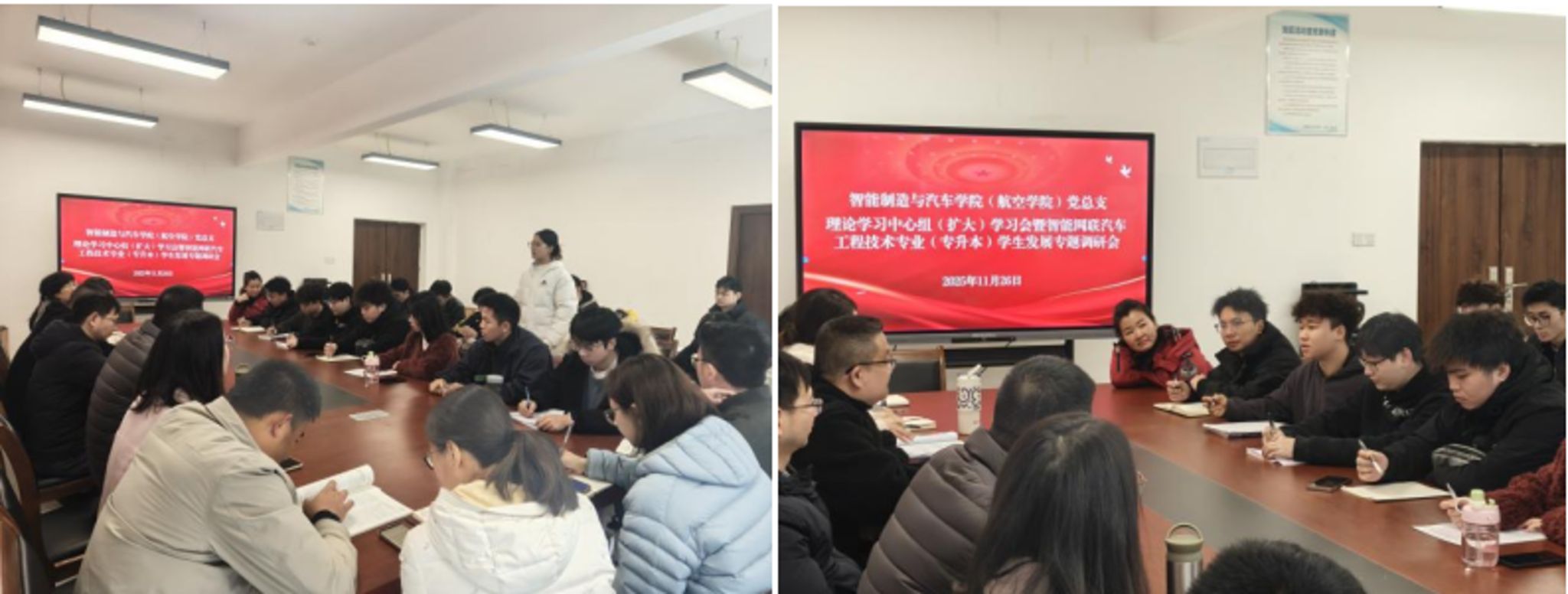 11月26日上午,我院在李苑五舍党员活动室召开“党总支理论学习中心组(扩大)学习会暨智能网联汽车工程技术(专升本)学生发展专题调研会”。会议由学院党总支书记丁伟主持,全体处科级干部、专业负责人及骨干教师、辅导员与30名学生代表面对面交流,现场回应学生诉求,共谋发展路径。