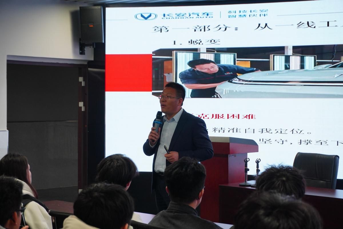 讲座现场,刘泗磊校友紧扣“劳动托举梦想,匠心铸就辉煌”核心主题,结合自身从一线学徒成长为行业领军人才的奋斗历程,以及智能制造行业的发展趋势,为在场听众带来了一场干货满满的分享。他坦言,成长从无捷径可走,正是凭借扎根生产一线的坚守,在日复一日的实操中积累经验、打磨技能,才实现了从“新手”到“合格工人”再到“技能大师”的蜕变。