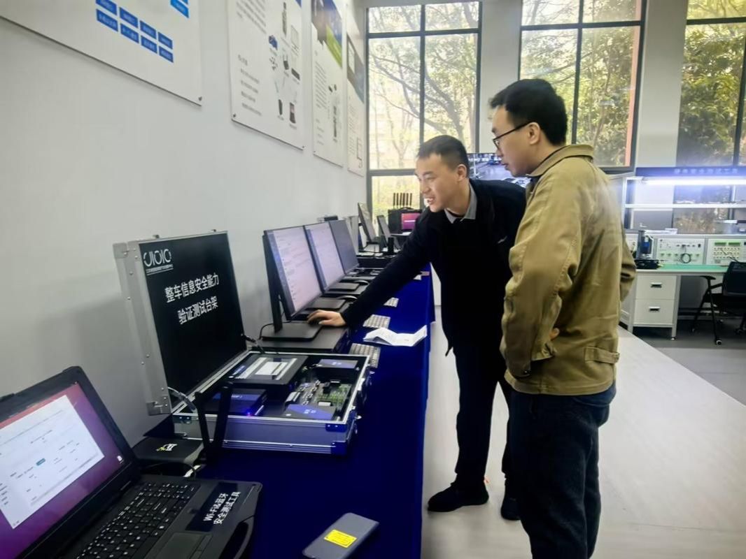 调研期间,罗杰主任、曾剑峰老师与公司相关技术负责人展开深入交流。双方重点围绕汽车信息安全检测技术现状、行业应用标准、人才技能需求,以及汽车芯片与软件工程技术研发进展、产业发展趋势、岗位核心能力要求等核心内容,进行全方位探讨与学习。技术人员现场演示了相关仪器的操作并进行现场技术分享。