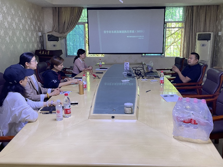 重庆领成信息技术有限公司侯总经理热情接待了来访教师一行,对公司的发展历程、业务范围、技术研发、战略规划等情况做了详尽的介绍,并就数字化车间及制造执行系统(MES)作了详细的讲解。