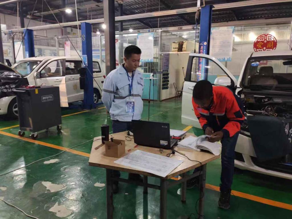 为了更好地提升“试考评”的成效,智能制造与汽车学院成立了以党总支书记和院长为组长的工作领导小组,制定了《关于汽车专业领域1+X职业技能等级证书“试考评”工作方案》全面推进试考评工作。为确保育训结合、质量至上的原则,学院了组织优秀的师资队伍制定了培训计划,4名培训教师分4组严格按照考评标准对南非学生进行了为期一周的专项培训,高标准要求,为试考评工作顺利开展打下了坚实的基础。